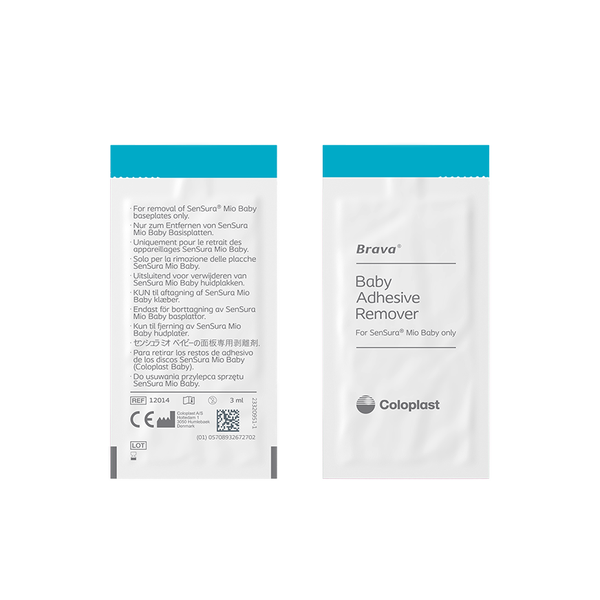 Brava® Baby Adhesive Remover shall be used when changing the SenSura® Mio Baby Baseplate. Brava Baby Adhesive Remover is silicone-based, alcohol-free and sting-free making it gentle on baby skin. It also facilitates gentle removal of the baseplate.